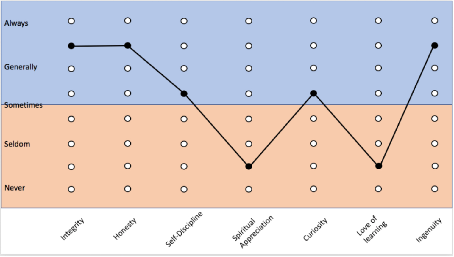 Step 1 – Character Awareness Graph (CAG). Using the CAG and Character Items (CI), the individual assesses their character and constructs a graph for self-reflection and analysis. If possible, they then seek additional CAGs to overlap their own assessment and find consistencies and inconsistences with their own and other’s assessments of their character.