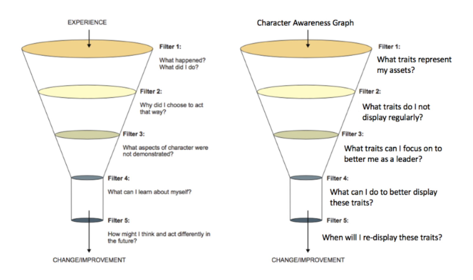 Step 2 – Analysis and self-reflection. With the data now generated, the individual is guided through an analytical process which has been inspired by the “filter” model of character development from doctrine. Through this, they highlight their strengths and weaknesses, either confirming or questioning the perception of others in comparison to their own. Again, this is either an individual experience or something that can be lead and guided as the situation demands.
